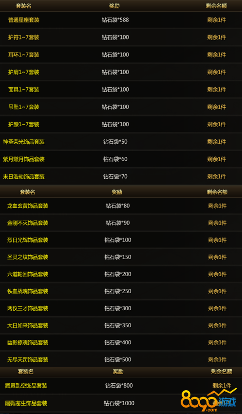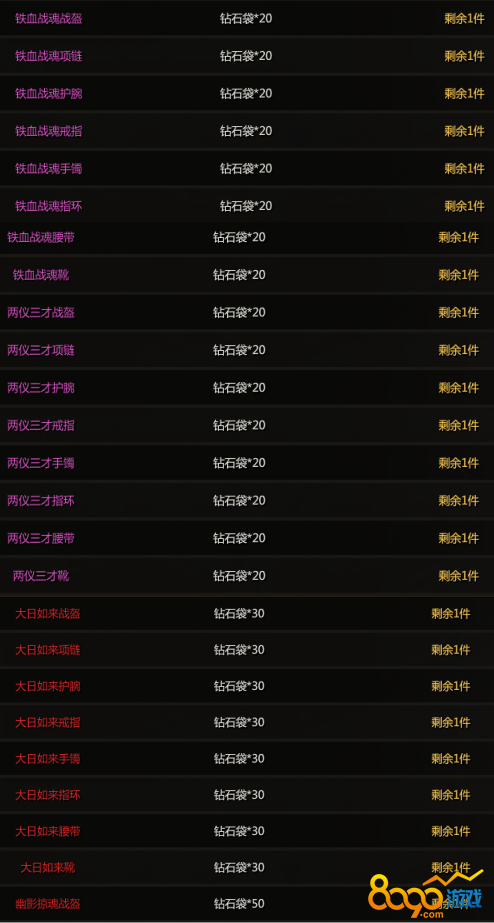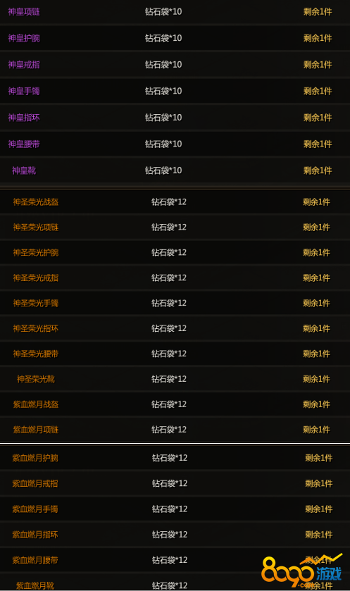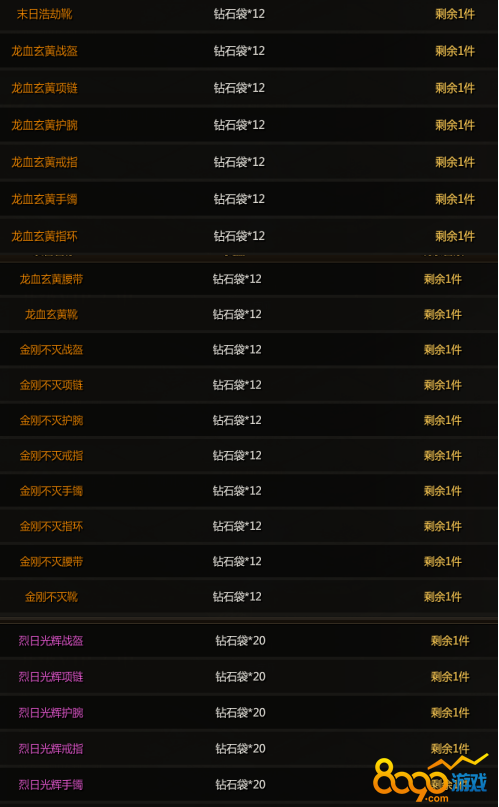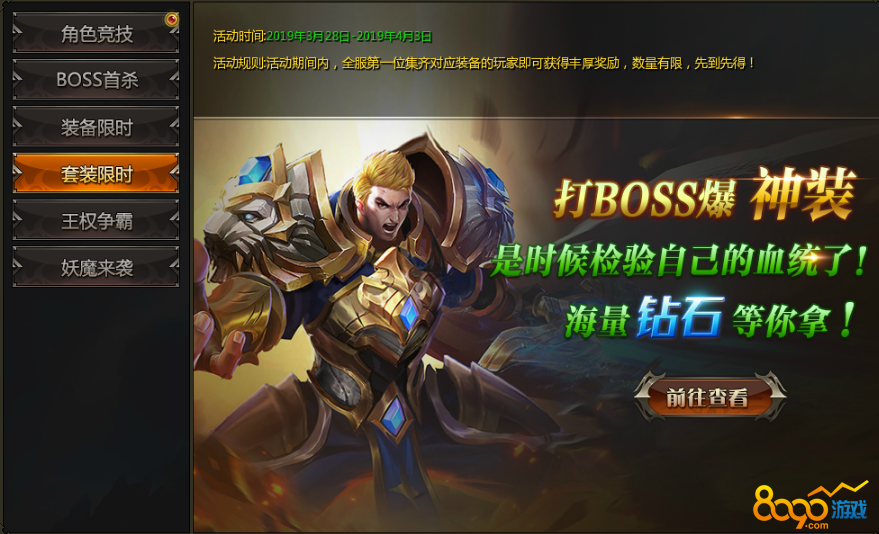【活动内容】活动期间内,全服第一位集齐对应装备的玩家即可获得丰厚奖励,数量有限,先到先得!打BOSS爆神装,是时候检验自己的血统了!海量钻石等你拿!
