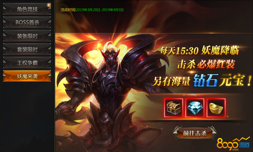【活动内容】每天15:05妖魔降临,击杀必爆红装,另有海量钻石元宝!
