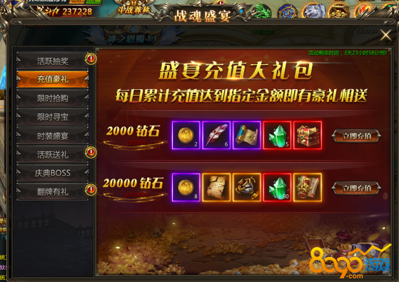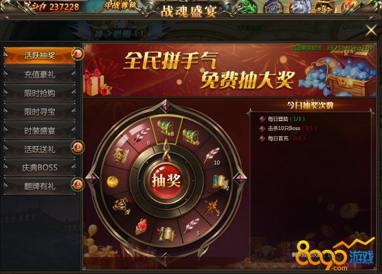 3. 活跃抽奖(登录,活跃击杀BOSS,每日充值可获得抽奖次数)活动规则:玩家在活动期间每日登录游戏,击杀BOSS达到指定数量,每日充值均可获得转动转盘的次数