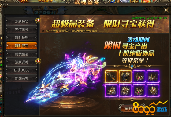 6. 限时寻宝(活动期间,投放特殊装备,提高寻宝概率)活动规则:活动期间寻宝库会加入绝版十阶饰品装备,这批装备只会投放在限时寻宝上,机会难得