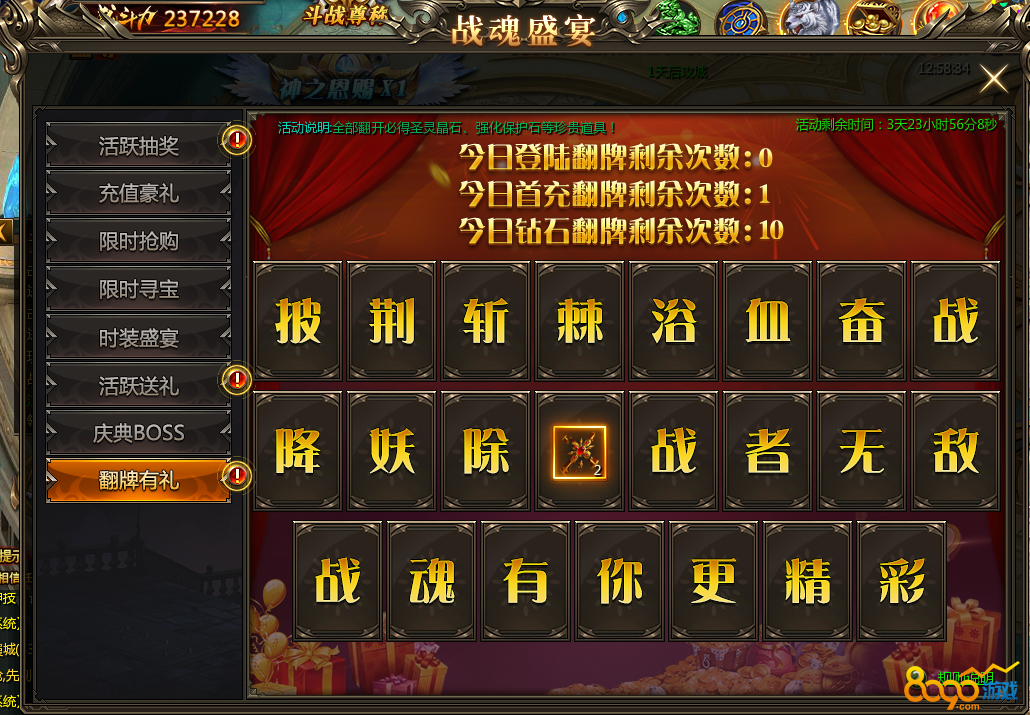 2. 翻牌有礼(登录,充值,消耗钻石都可以获得翻牌子次数,翻开牌子获得道具)活动规则:玩家在活动期间每日登录游戏,每日首次充值均可获得翻牌子次数,另外还可以花费钻石直接翻牌子