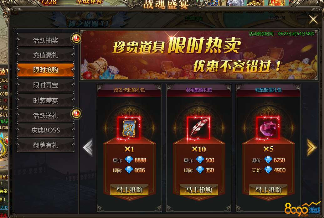 5. 限时抢购(活动期间,部分珍稀道具限时折扣销售)活动规则:活动期间,部分日常热购道具限时打折出售,每人有限购数量,购完即止