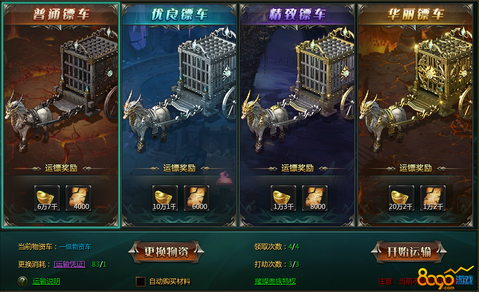 在8090《浴血战魂》游戏中物资运送任务可以通过运输凭证来更换物资车的等级,物资车等级越高运镖的奖励也越高。