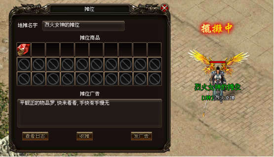 如上图所述,摊位还有广告位哦,正所谓“平靓的物品罗,快来看看,手快有手慢无”。同时玩家们还可以查看日志,学会收摊,发广告等等,对于有经验的玩家来说,这是一个绝好的机会。