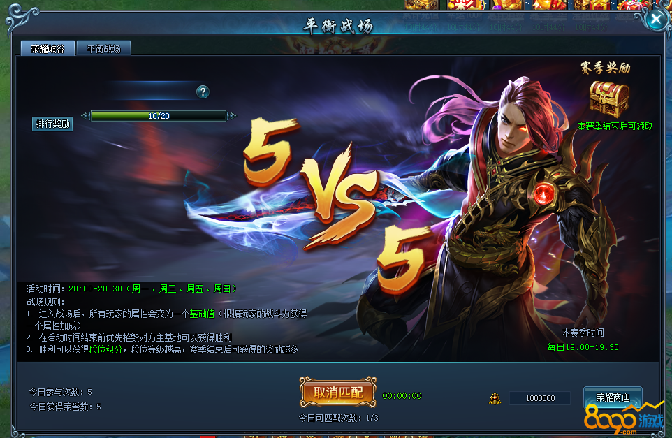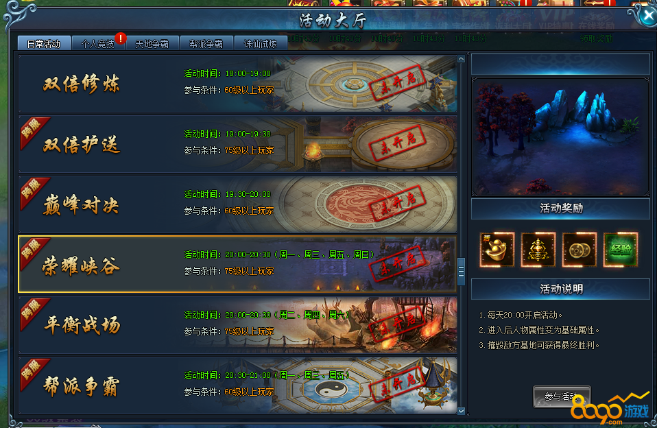 荣耀峡谷活动为20:00-20:30(每周一、三、五、日)。65级以上的玩家可以参加。