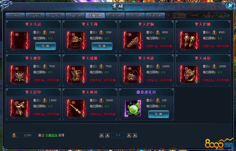 参加平衡战场和荣耀峡谷活动,可获得荣耀值,消耗一定的荣耀值,可在商城内兑换荣耀装备,每件装备会附带一种攻击技能。