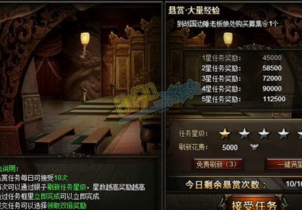 2.通过金币刷新任务星级(10元宝可以一键满星),完成相应的任务要求后,返回巨鹿雪原---NPC悬赏任务使者
