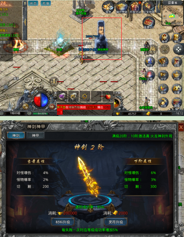 1. 神剑提供对怪增伤、怪物爆率、切割等属性加成;神甲提供怪物爆率、对怪免伤、对怪减伤等属性。