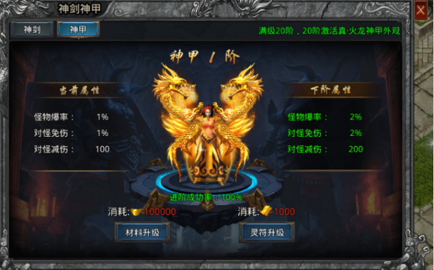2. 玩家可可选择消耗元宝或灵符两种方式来升级,每阶所需材料不同且逐级增长,神剑、神甲各20阶。