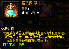 现在的超级祝福油只能商城买了,当然了要是觉得自己脸好,或者想要一把好武器的话,寻宝也不失一种很好的获取祝福油的方式,普通祝福油上2之后用超级的就能跳过高失败率的幸运强化阶段。