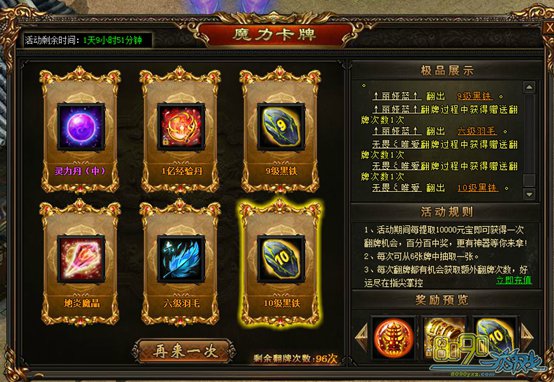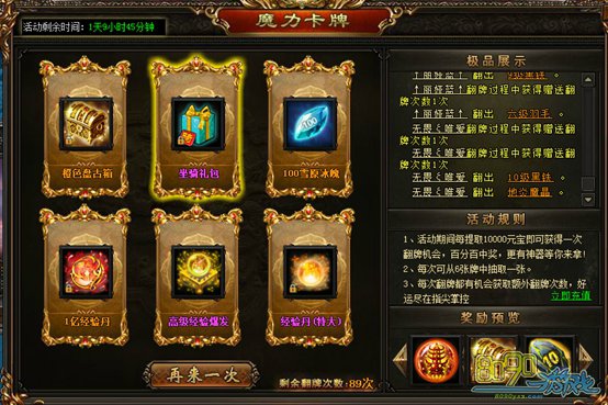 活动内容: 活动期间,每提取10000元宝即可获得一次翻牌机会,百分百中奖,更有神器等你来拿!每次翻牌从6张牌中抽取一张,必定获得奖励!翻牌时更有机会获取额外的翻牌次数哦!