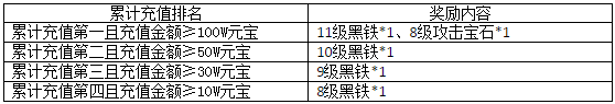 【活动内容】:活动期间,每天充值任意金额即可领取惊喜礼包1个,每日累计充值达到10000、50000、100000、200000时还可领取回馈礼包、百炼黑铁礼包以及超级黑铁礼盒等珍惜道具!