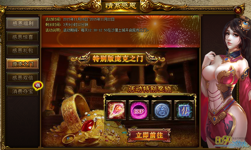 活动内容:活动期间,每天12:30`12:50在沙漠土城开启特别版庞克之门活动,大量经验和道具奖励等你来!
