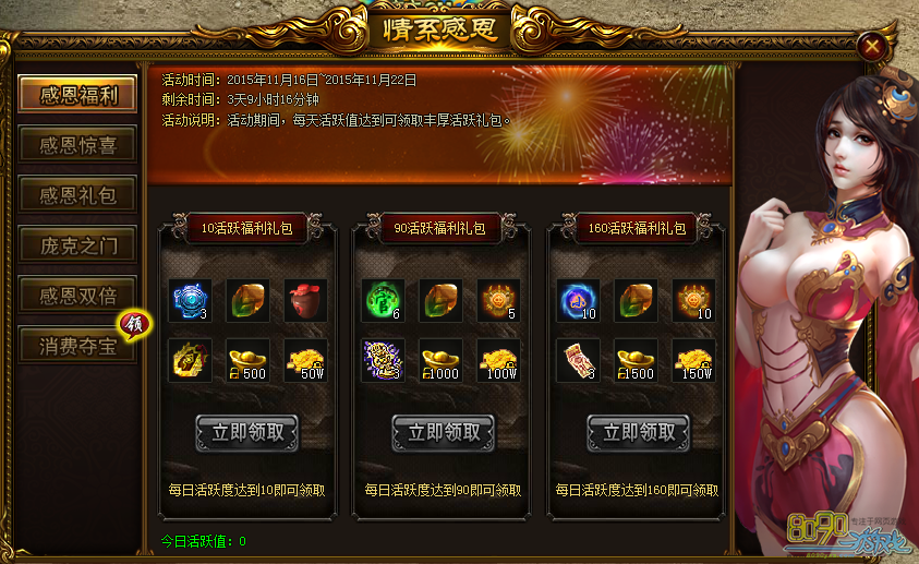 活动内容:活动期间,每日活跃值达到10、90、160时可分别领取丰厚奖励1份!
