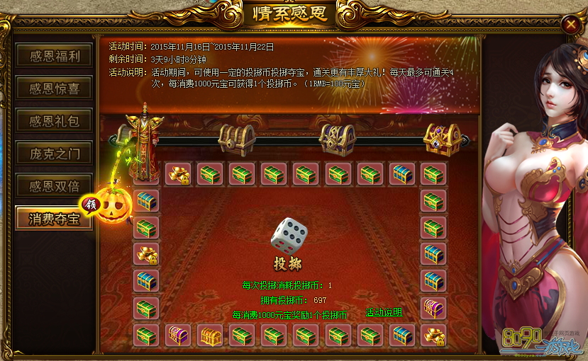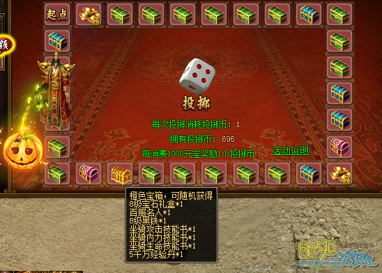 活动内容:活动期间,可使用投掷币进行夺宝,通关更有丰厚大礼!每天最多可通关4次。,每消费1000元宝可获得1个投掷币,每次投掷骰子可依次按照投掷结果向前行进相应步数,通关还可获得丰厚奖励礼包,每天最多可通关4次。行进到对应格子时可随机获得其中的某个奖励,更有大量珍稀道具!