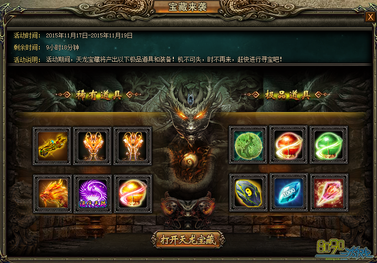 活动内容:活动期间,天龙宝藏将产出以下极品道具和装备!机不可失,时不再来,赶快进行寻宝吧!