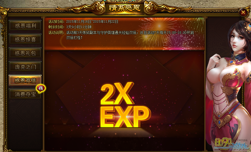 活动内容:活动前3天 炼狱副本与守护英雄副本通关经验双倍,每天15:00~18:00开启全服双倍打怪!