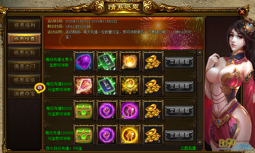 活动内容:活动期间,每日充值任意金额元宝即可领取奖励1份,每日累计充值元宝达到10000、50000、100000、200000时还可分别领取对应的丰厚充值奖励!