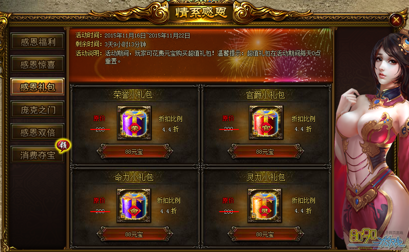 活动内容:活动期间,玩家可花费元宝购买超值礼包!温馨提示:超值礼包在活动期间每天0点重置。