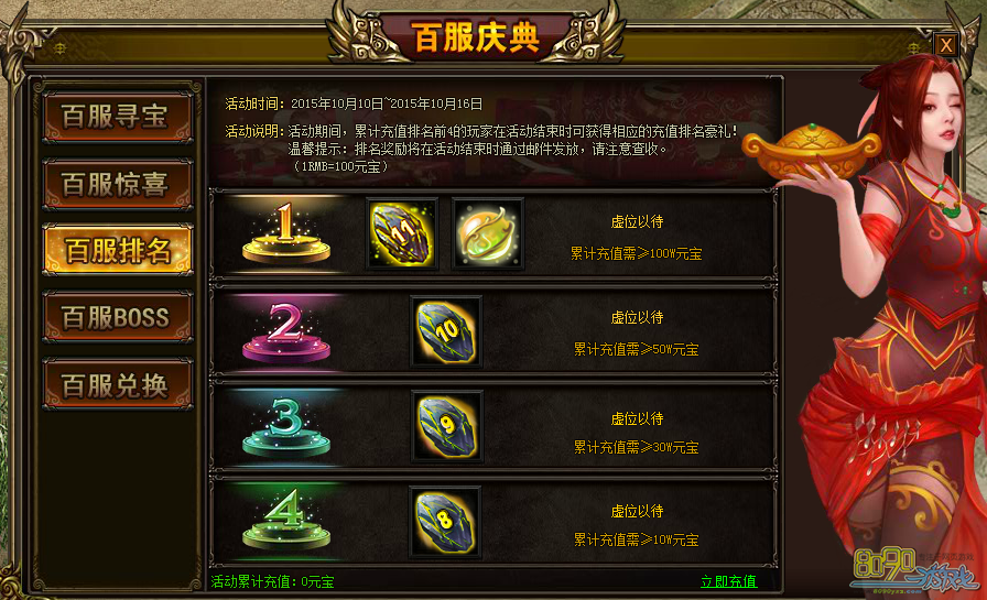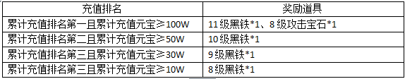 【活动内容】:活动期间,累计充值排名前三的玩家在活动结束时可获得相应的充值排名豪礼!奖励在活动结束后通过邮件形式发放!