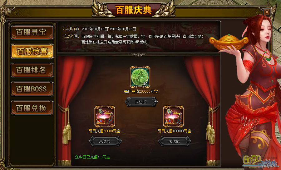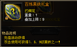 【活动内容】:百服活动期间,每天充值一定数量元宝,即可领取百炼黑铁礼盒回馈奖励!每天累计充值达到50000元宝,可以领取1个百炼黑铁礼盒,每天累计充值达到100000元宝,可以再领取2个百炼黑铁礼盒,开启百炼黑铁礼盒可随机获得7~9级黑铁之一!