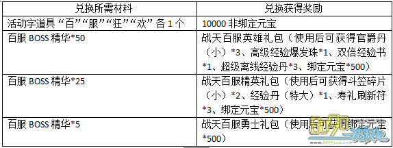 【活动内容】:百服活动期间,可通过击杀BOSS收集百服BOSS精华来兑换奖励,
