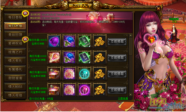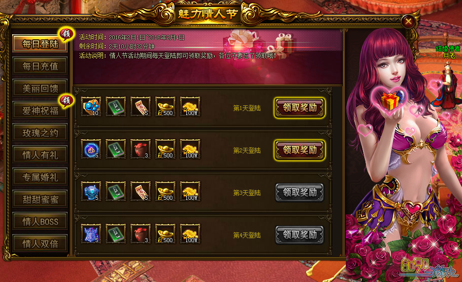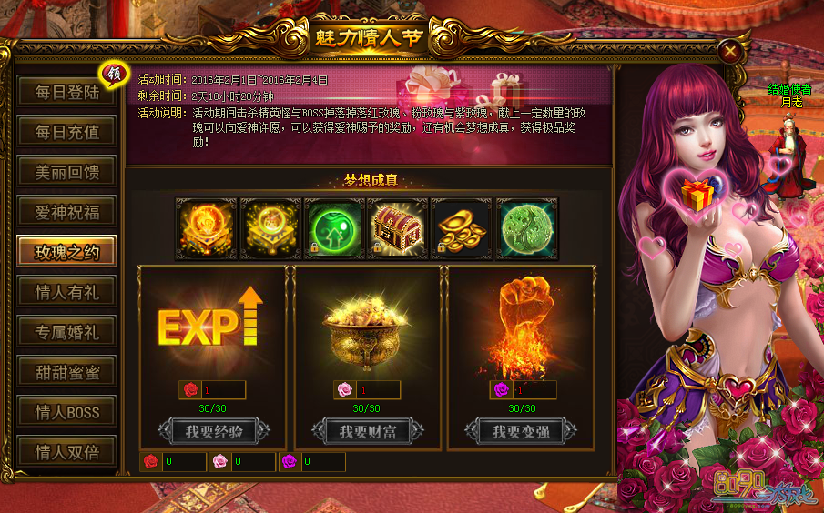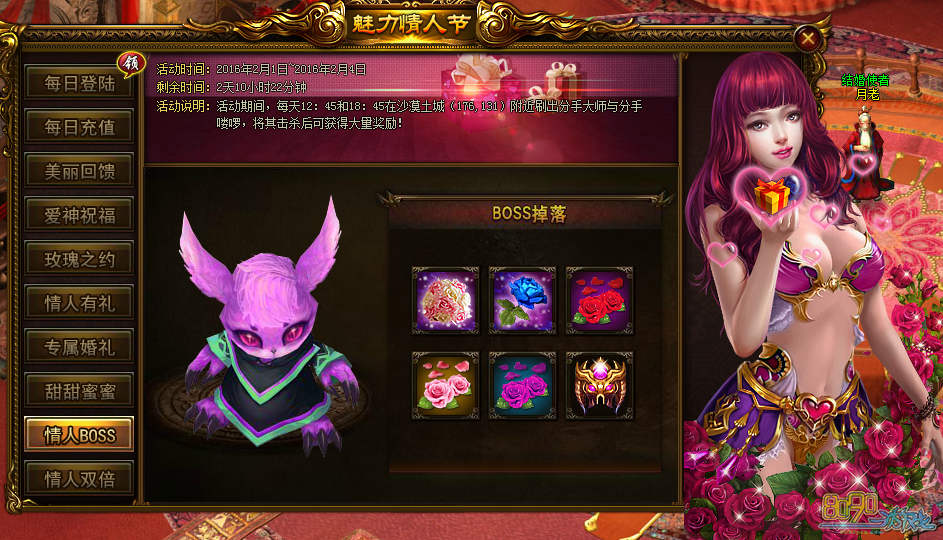 活动内容:活动期间击杀精英怪和BOSS掉落红玫瑰、粉玫瑰与紫玫瑰。献上一定数量的玫瑰可向爱神许愿,可获得经验、金币以及大量属性道具!