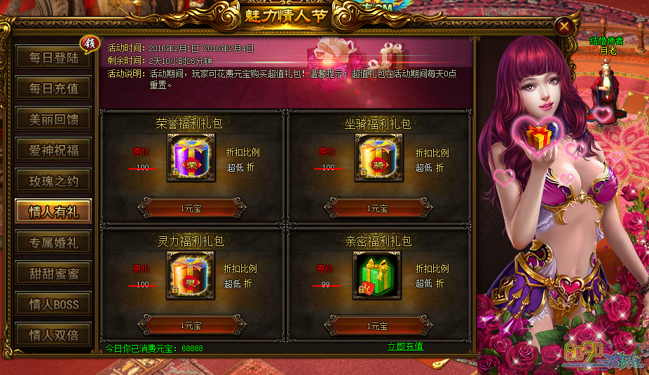 活动内容: 活动期间,玩家可花费元宝购买超值礼包!礼包每天0点重置购买次数。