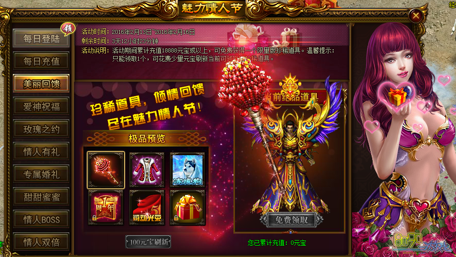 活动内容:活动期间累计充值18888元宝以上,即可免费获得一个限量版珍稀道具,只能领取1个,可花费少量元宝进行刷新!
