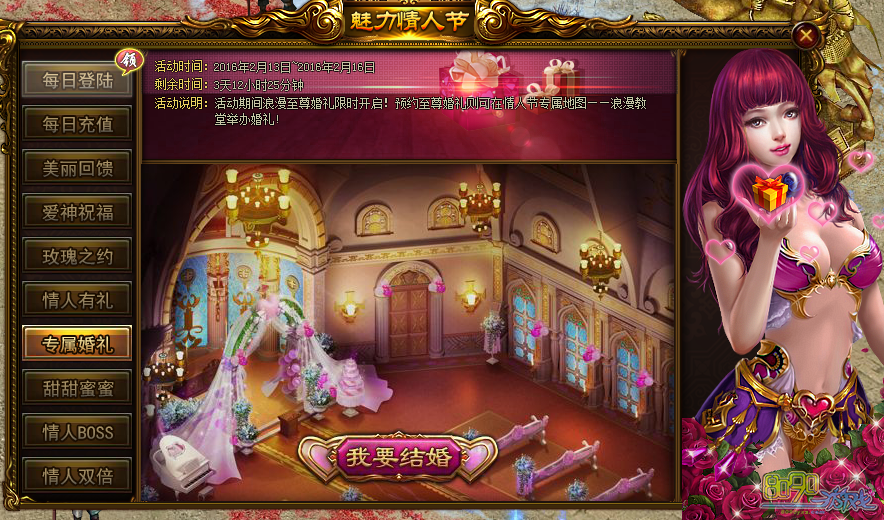 活动内容:单身诚可贵,结婚价更高!活动期间,预约婚礼即可领取额外的奖励,更有激活获得情人节专属婚礼时装“白马王子(男)”、“天使之恋(女)”!每一种奖励每天只能领取1次!