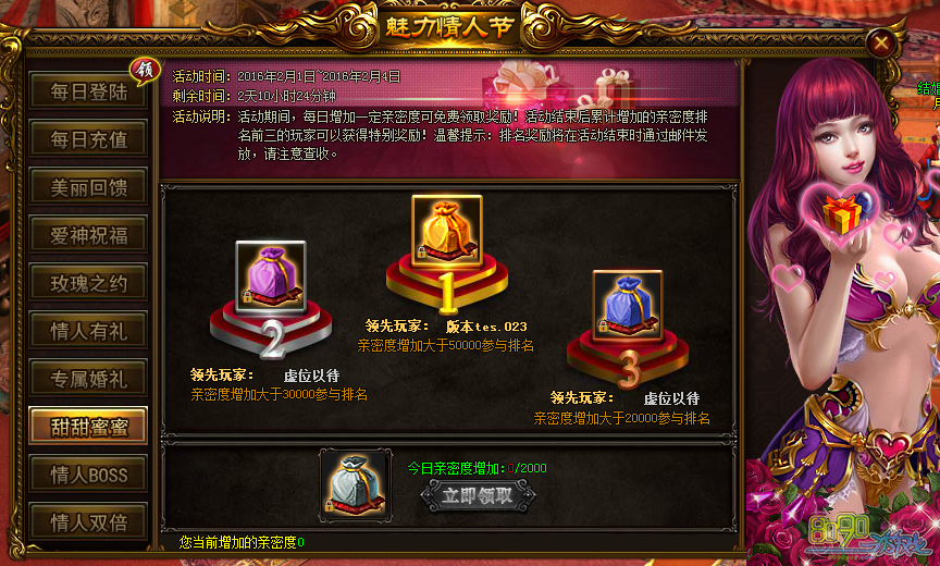 活动内容:活动期间,每日增加一定亲密度可免费领取奖励,活动结束后累计增加亲密度排名前三的玩家可以获得情人节专属称号特别奖励!