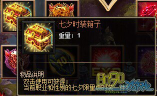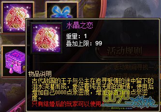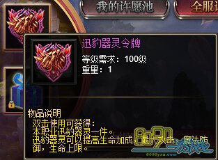 【活动内容】:活动期间,每花费1000元宝可进行一次许愿,每次必定获得道具,有几率获得七夕时装箱、玄武器灵令牌、迅豹器灵令牌、猛犸器灵令牌、水晶之恋、海量经验丹(10亿)10级黑铁等大量珍稀道具!
