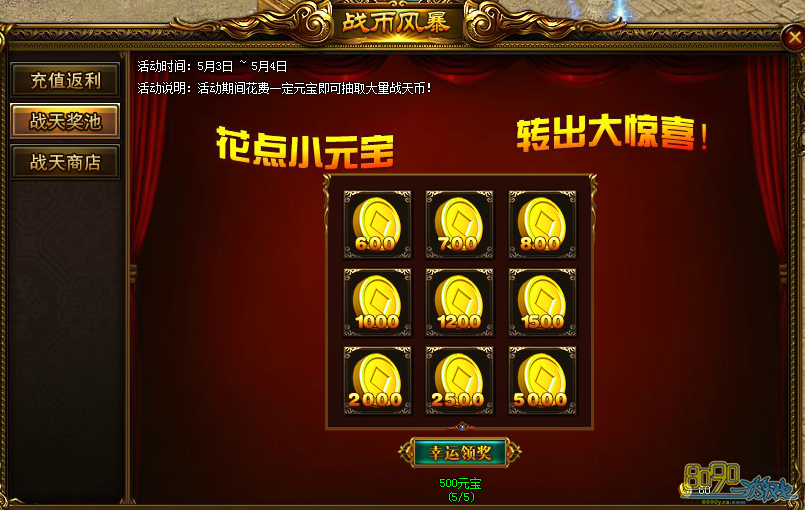 活动内容:活动期间每充值一定元宝可免费领取战天币!
