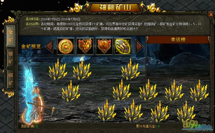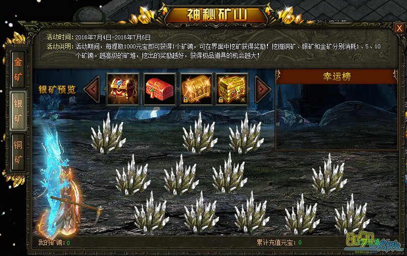 活动内容:活动期间,每提取1000元宝即可获得1个矿锄,在界面内挖矿可获得奖励!挖掘1次铜矿、银矿、和金矿分别消耗1、5、10个矿锄,越高级的矿堆可挖出的奖励越丰富,获得极品道具的几率也越大!