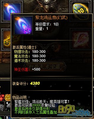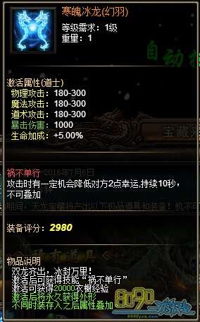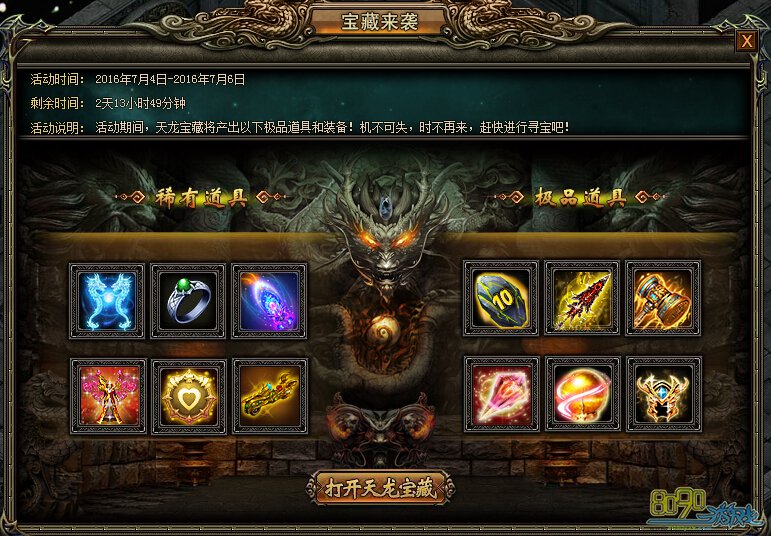 活动内容:活动期间,天龙宝藏中将产出紫龙鸿运扇(幻武)、寒魄冰龙(幻羽)等各种珍稀道具!机不可失!