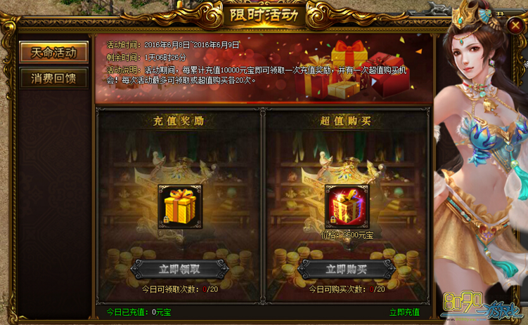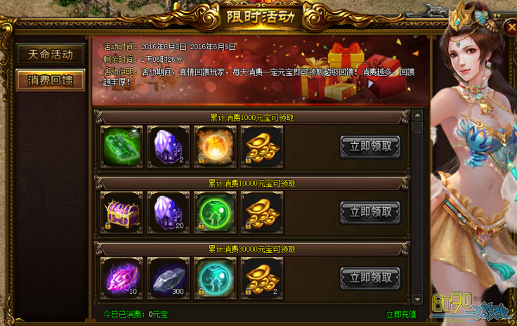 活动说明:活动期间,真情回馈玩家,每天消费一定元宝即可领取超值回馈!消费越多,回馈越丰厚!