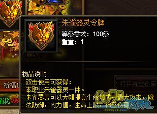 【活动内容】:活动期间,使用500元宝可进行一次祈福或者4950元宝进行10次祈福,大量珍稀道具:金护乾坤镜、三生镇魂塔、白虎器灵令牌、朱雀器灵令牌、11级黑铁、特戒结晶、天尊装备箱等!
