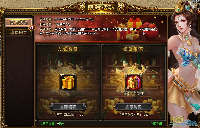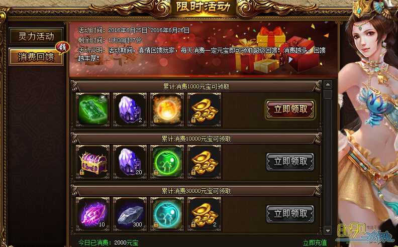 活动说明:活动期间,真情回馈玩家,每天消费一定元宝即可领取超值回馈!消费越多,回馈越丰厚!