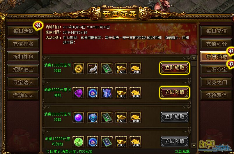活动内容:活动期间,真情回馈玩家,每天消费一定元宝即可领取超级回馈!消费越多,回馈越丰厚!