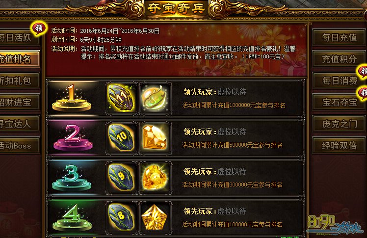 活动内容:活动期间,累计充值排名前4的玩家在活动结束时可获得相应的充值排名豪礼!温馨提示:排名奖励将在活动结束时邮件发放!请留意查收。(1RMB=100元宝)