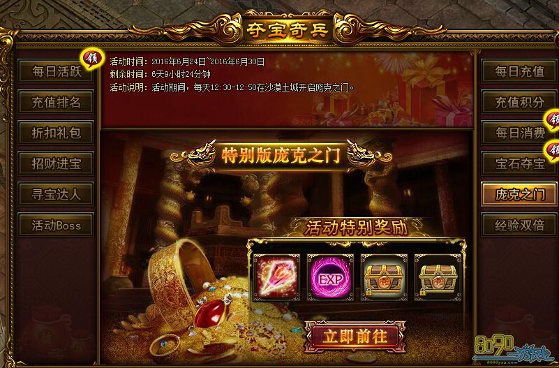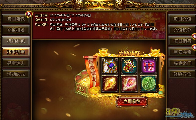 活动内容:活动期间,财神每天12:20-12:50和18:20-18:50在沙漠土城(143,123)派发福利!届时只要献上招财进宝即可获得丰厚奖励!招财进宝可以功过击杀Boss获得。