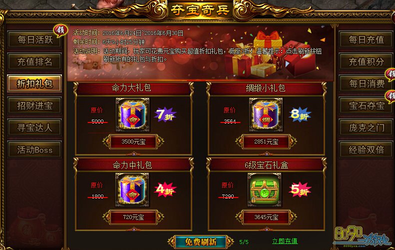 活动内容:活动期间,玩家可花费元宝购买超值折扣礼包,低至3折!温馨提示:典籍刷新按钮刷新所有礼包与折扣。