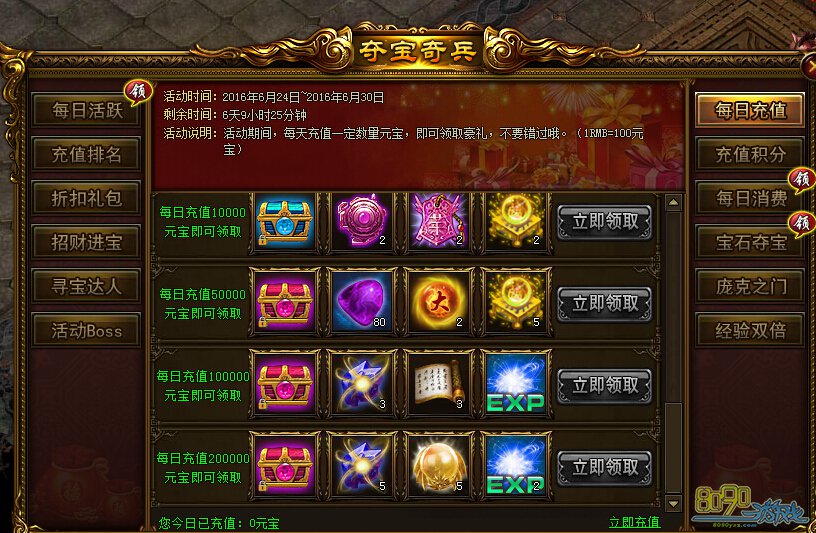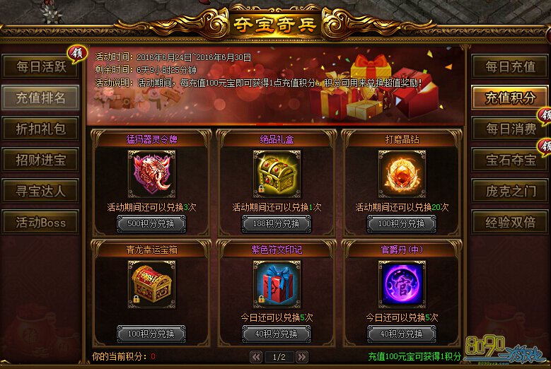 活动内容:活动期间,每充值100元宝即可获得1点充值积分,积分可以用来兑换超值奖励!