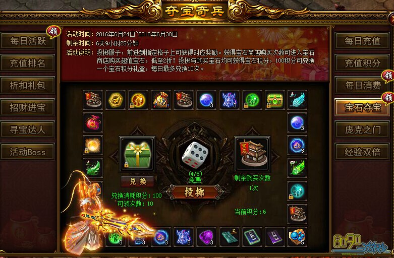 活动内容:投掷骰子,前进到指定格子上即可获得对应奖励。获得宝石商店购买次数可进入宝石商店购买超值宝石,低至2折!投掷与购买宝石均可获得宝石积分,100积分可兑换一个宝石积分礼盒,每日最多兑换10次。