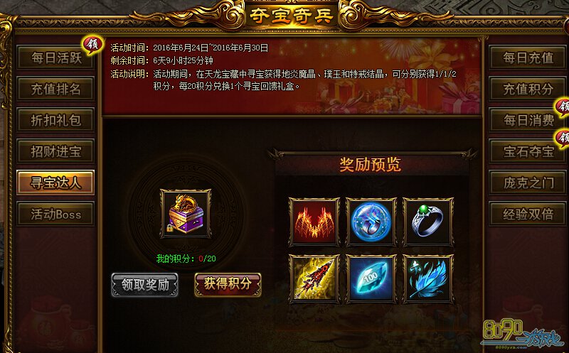 活动内容:活动期间,在天龙宝藏中寻宝获得地炎魔晶、璞玉和特戒结晶,可分别获得1/1/2积分,每20积分兑换1个寻宝回馈礼盒。