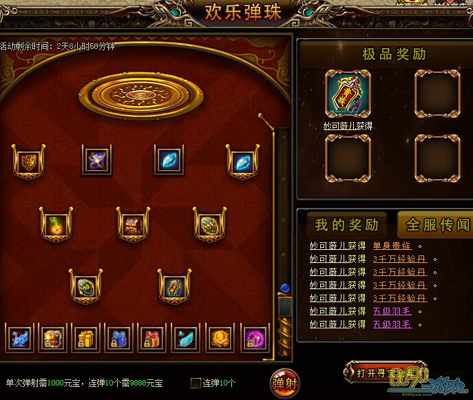 活动期间,玩家花费1000元宝即可弹射弹珠一次。将有机会获得朱雀器灵令牌、南瓜灯(幻武)、齐天大圣时装礼盒、11铁等珍贵道具。花费9888可连续弹射10次弹珠。