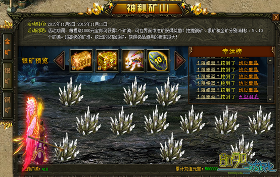 【活动内容】:活动期间,每提取1000元宝即可获得1个矿锄,在界面内挖矿可获得奖励!挖掘1次铜矿、银矿、和金矿分别消耗1、5、10个矿锄,越高级的矿堆可挖出的奖励越丰富,获得极品道具的几率也越大!