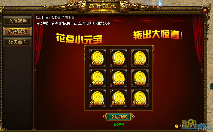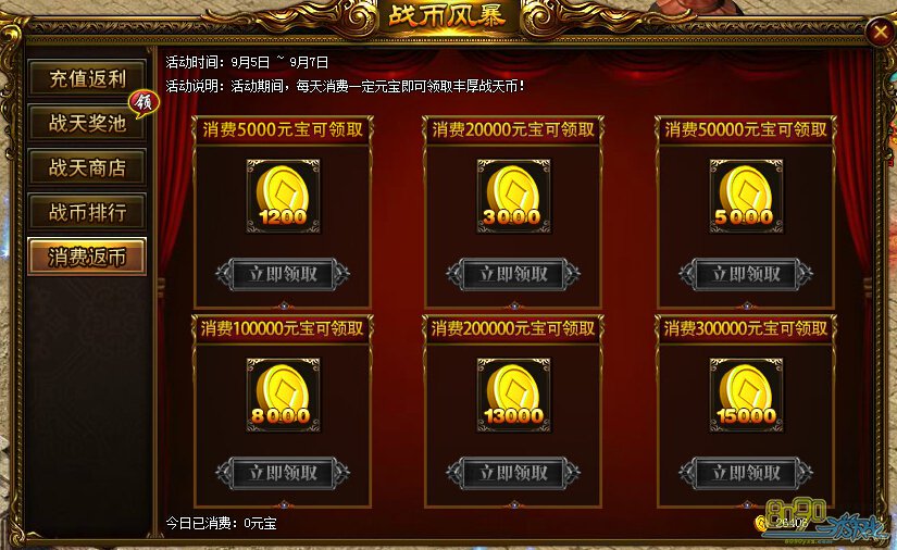 活动说明:活动期间,每天消费一定元宝即可领取丰厚战天币!