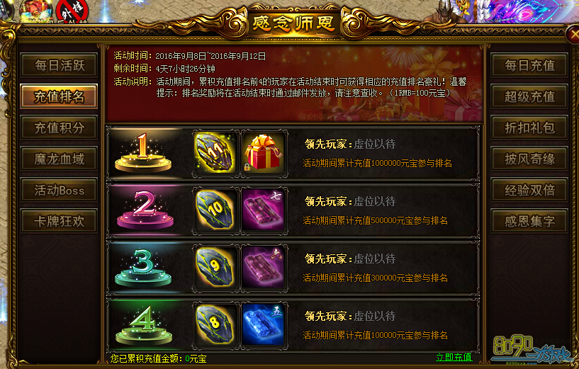 活动内容:活动期间,累计充值排名前4的玩家在活动结束时可获得相应的充值排名豪礼!温馨提示:排名奖励将在活动结束时邮件发放!请留意查收。(1RMB=100元宝)