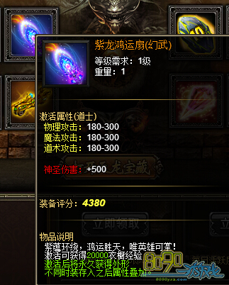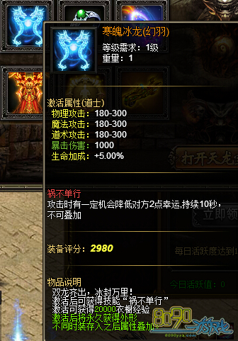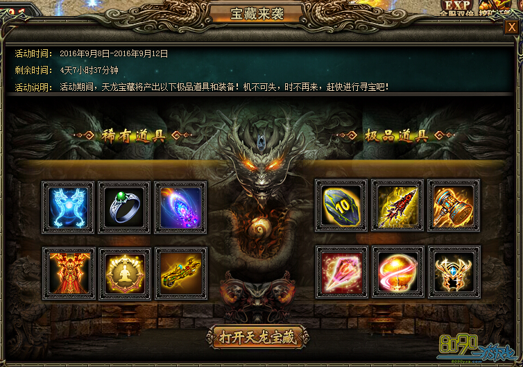 活动内容:活动期间,天龙宝藏将产出寒魄冰龙(幻羽)、九霄至尊(幻装)、紫龙鸿运扇(幻武)、神工鬼力以及战天传奇套装等极品装备,快来寻宝吧!